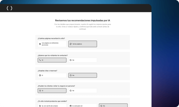 Dile al Asistente IA de WordPress qué te gustaría conseguir con tu página web: vender servicios o productos, promover eventos, promocionar un negocio físico, atraer tráfico a tu web, conseguir llamadas telefónicas, etc. Selecciona las opciones que quieras y el Asistente IA le añadirá estas funcionalidades a tu web.