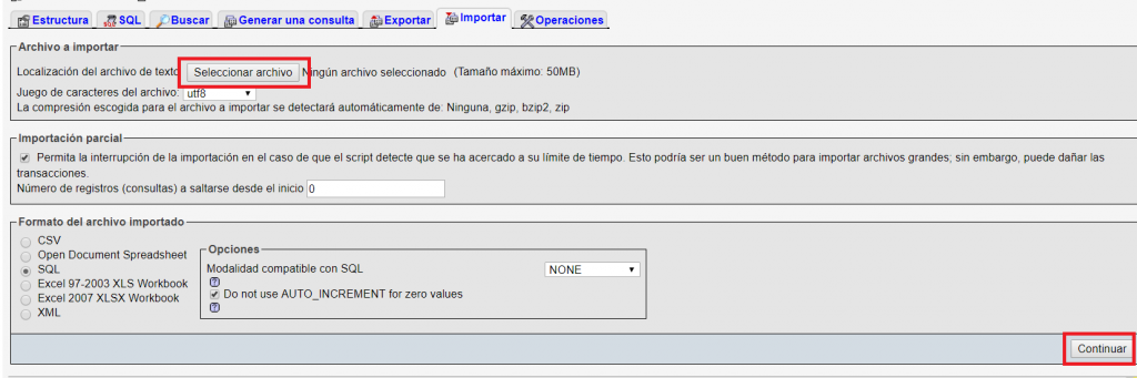 Con el botón de ‘Seleccionar Archivo’ busca en tu ordenador el fichero .sql o .sql.zip y selecciónalo. Luego, con ‘Continuar’, inicia la importación.