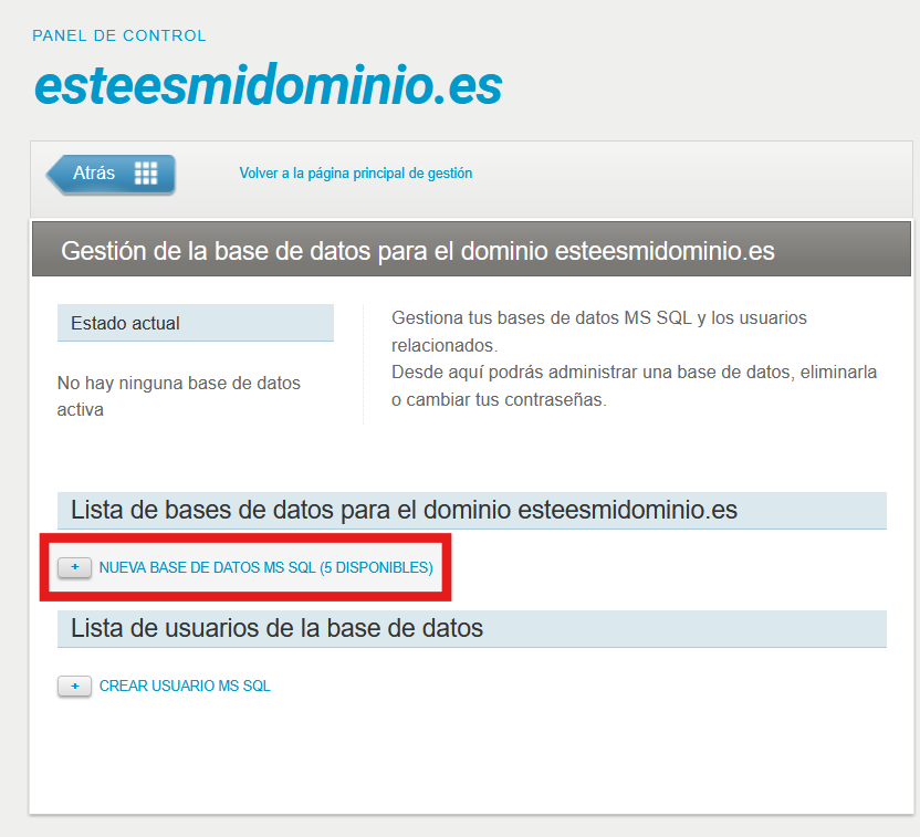 En la siguiente pantalla, haz clic en "Nueva Base de Datos MS SQL" para empezar a crearla: