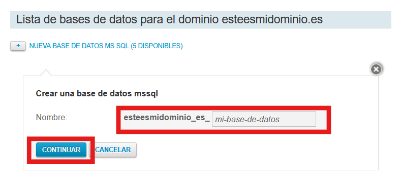 Ponle un nombre a la base de datos y haz clic en el botón "Continuar":