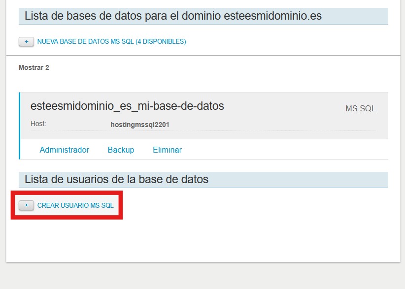 En el panel del Hosting Windows, haz clic en !Base de Datos Microsoft SQL Server":