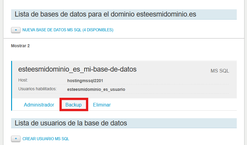 Aquí verás la lista de las bases de datos que hay creadas actualmente en tu hosting. Localiza la que quieres descargar y haz clic en "Backup":