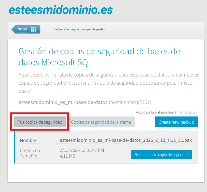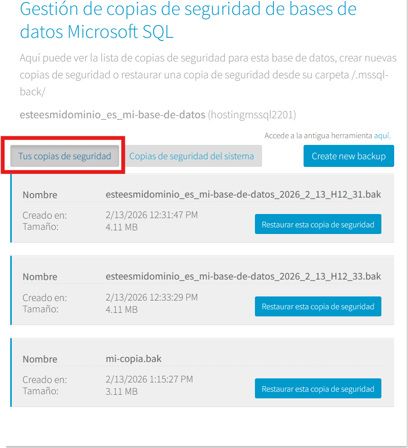 En la siguiente ventana, ve a la pestaña "Tus copias de seguridad". Aquí aparecerán los backups que tu hayas creado a través de esta página y el que has subido por FTP: