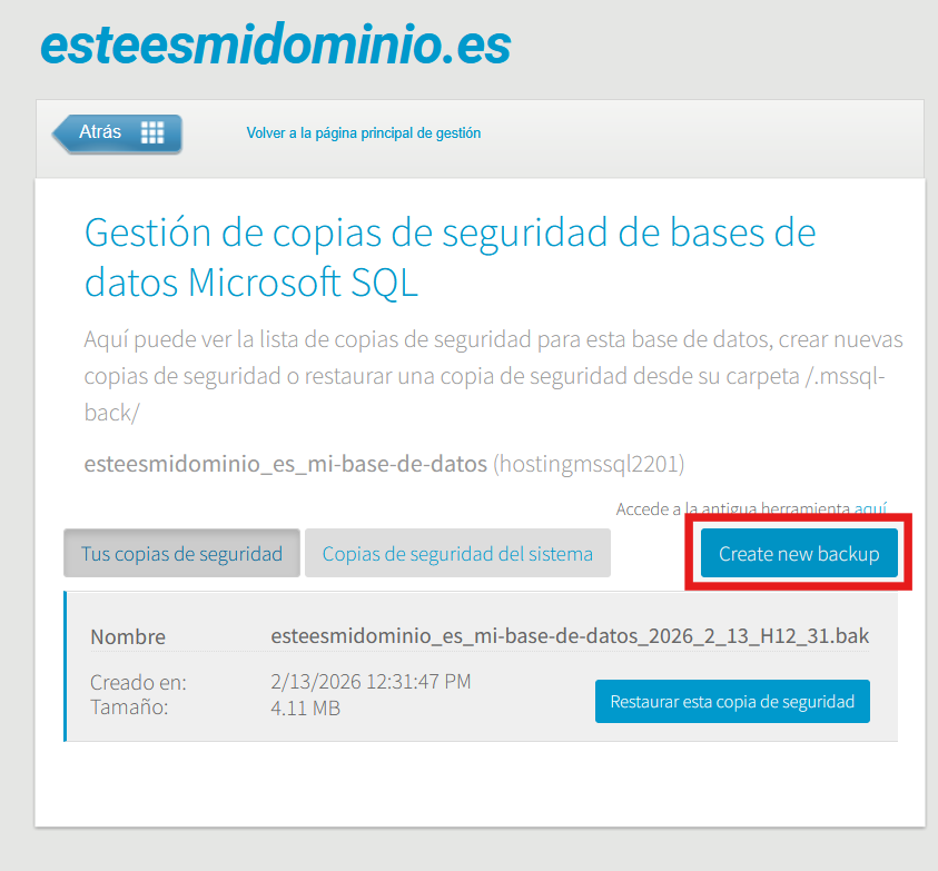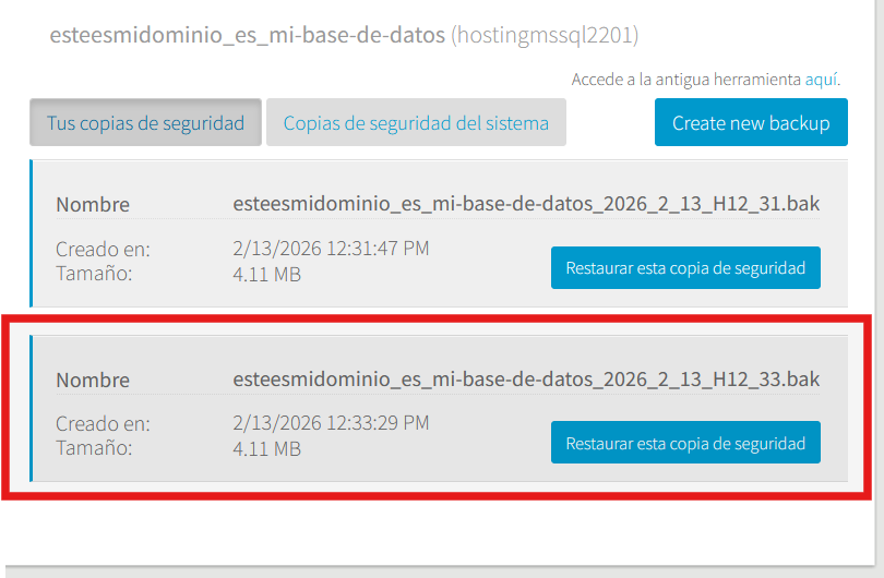 Para crear un nuevo backup de la base de datos actual, haz clic en el botón de "Create new backup":