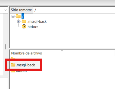 Primero conéctate por FTP al Hosting. Una vez conectado por FTP, dirígete hacia la carpeta "/.mssql-back" del mismo: