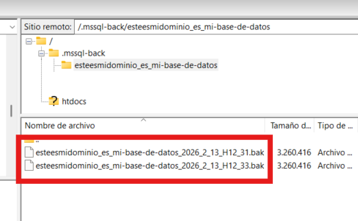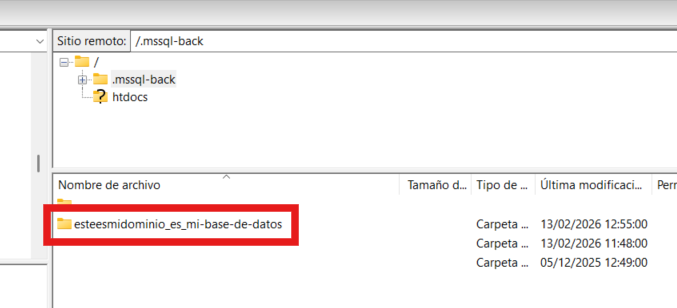 Ahora, para descargarlo al ordenador, conéctate por FTP a tu alojamiento y entra a la carpeta "/.mssql-back" del mismo: