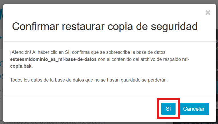 IMPORTANTE: Este proceso sobreescribirá toda la información que tengas actualmente en la base de datos, por lo que haz una copia de seguridad de tu base de datos actual antes.