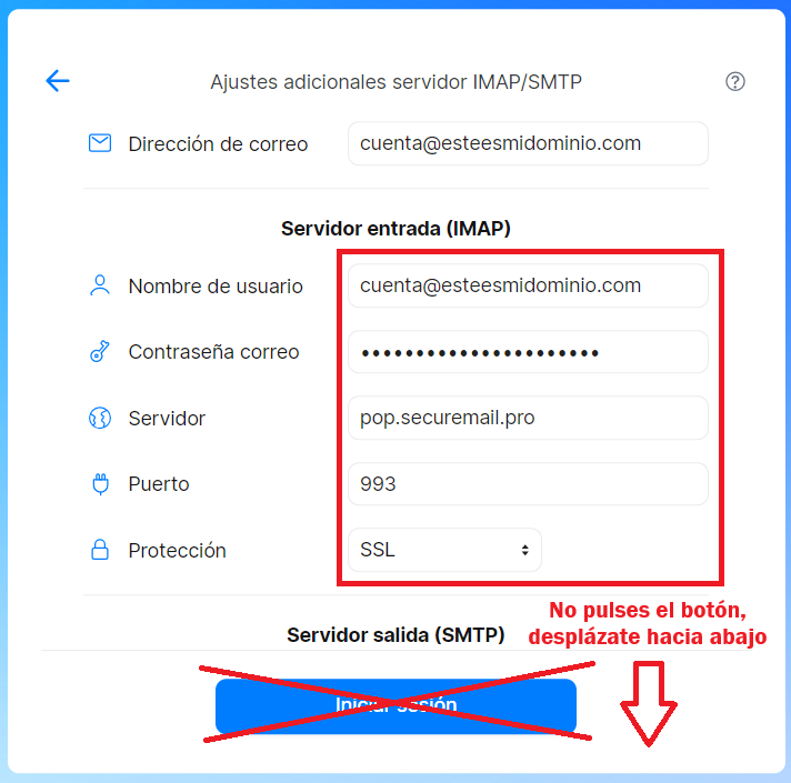 En la siguiente pantalla te pedirá los datos del "Servidor de correo entrante (IMAP)" y del "Servidor de correo saliente (SMTP)". Rellénalos de esta forma: