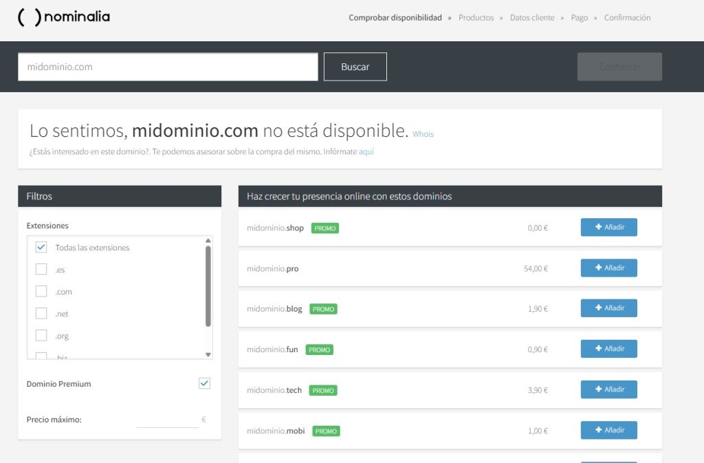 Una vez que encuentres un dominio disponible que te guste, el siguiente paso es registrarlo. En Nominalia, simplemente haz clic en “Añadir al carrito” y se iniciará el proceso de compra.
