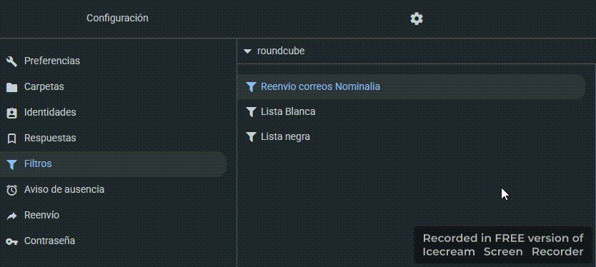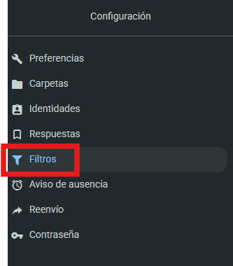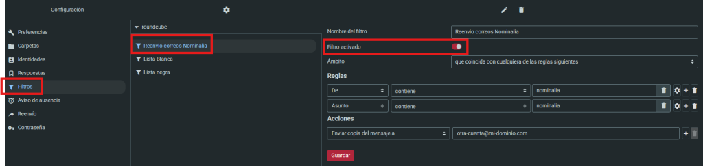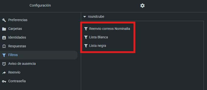IMPORTANTE: Si tienes varios filtros, estos se ejecutarán en orden, de arriba abajo, por lo que es recomendable que organices las reglas según el orden en el que quieres que se vayan ejecutando. Por ejemplo, es recomendable que las reglas de lista blanca y lista negra, sean las primeras.