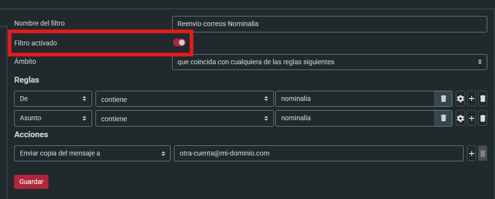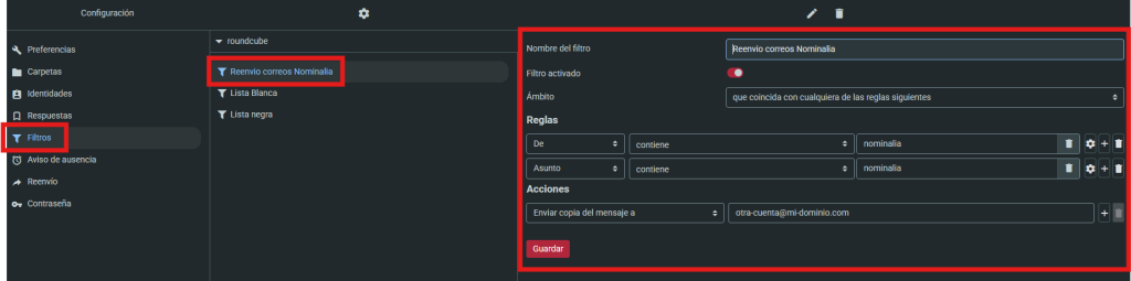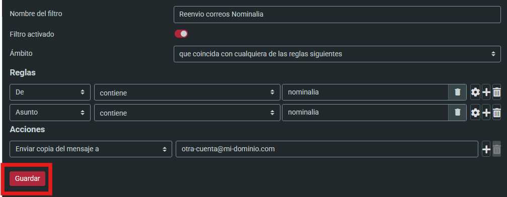 IMPORTANTE: No dejará copia del correo en tu buzón de Webmail por defecto. Para que se guarde copia en Webmail, deberás crear antes de esta acción, otra acción de “Archivar en” (poniendo como carpeta de destino, la que quieras en la que se guarde).
