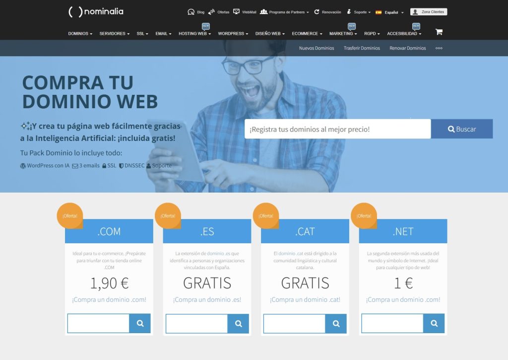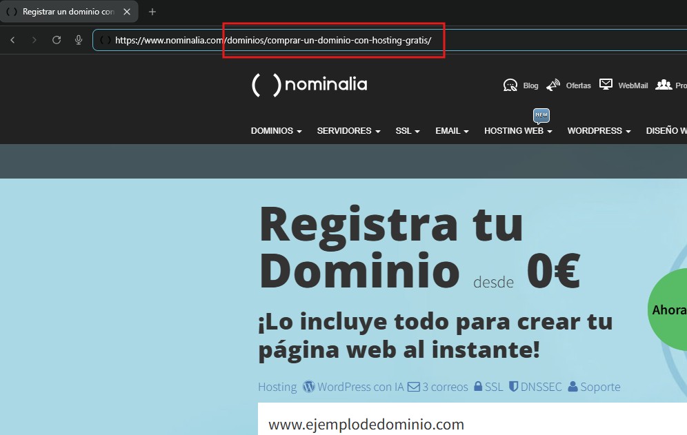 El dominio es la identidad única de tu sitio web en Internet. Es esa combinación de palabras y extensión que escribes en el navegador para llegar a una web específica, como “nominalia.com” o “tiendaonline.es”.