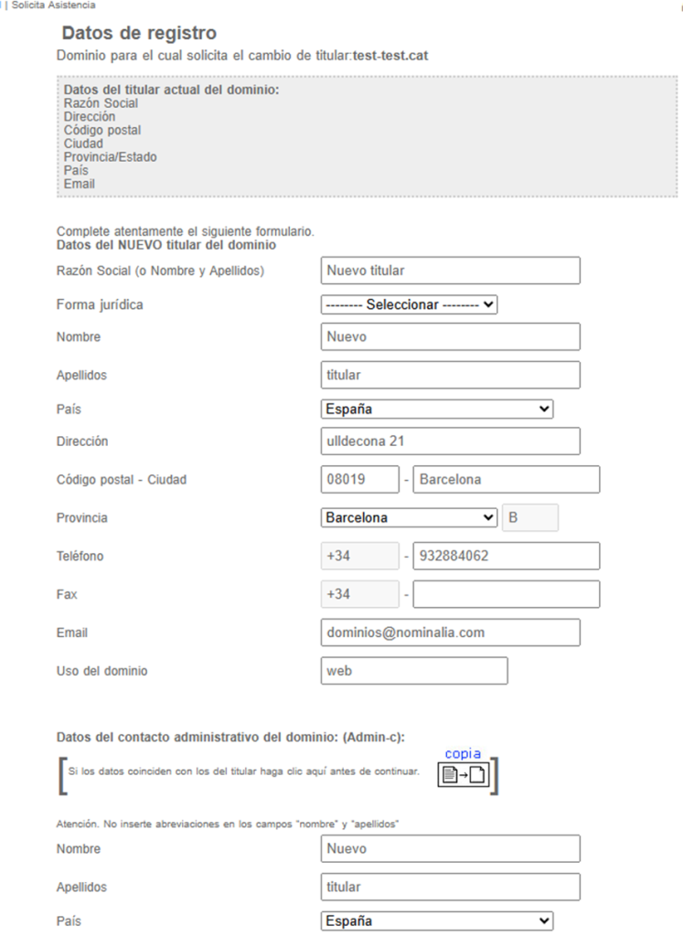 Llegarás al formulario donde deberás indicar los datos del nuevo Titular y Contacto Administrativo: