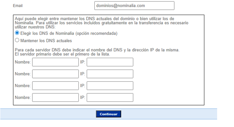 Al final del formulario, deberás indicar los servidores DNS. Si tienes los de Nominalia, puedes marcar “Elegir los DNS de Nominalia”. Si tienes configurados servidores DNS propios o de terceros, debes seleccionar “Mantener los DNS actuales” e indicar los servidores y sus IP: