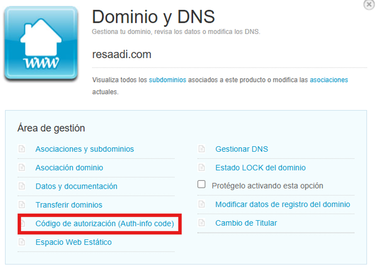 Copia el código que aparece como auth-info para autorizar la transferencia de tu dominio.