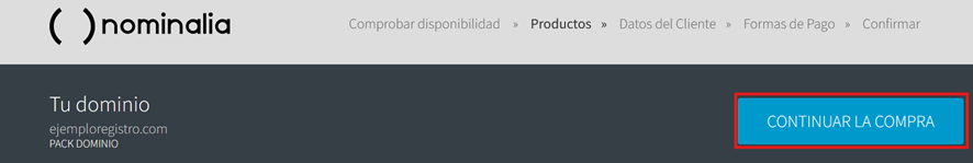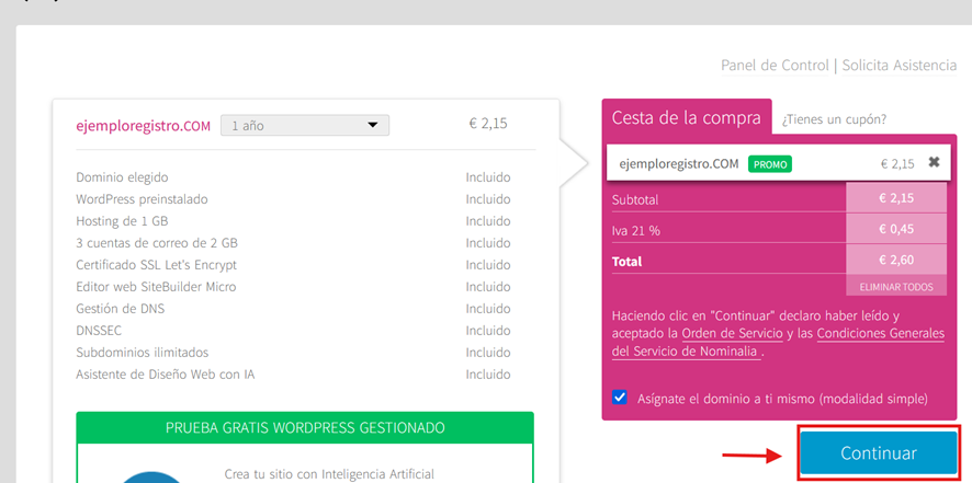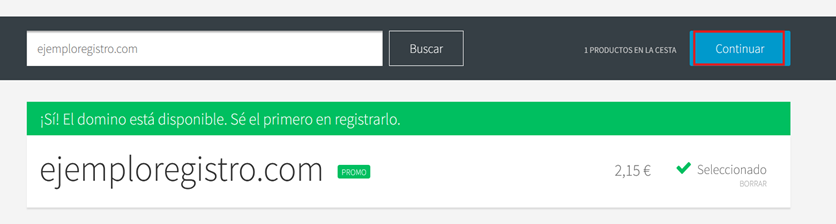 Se te abrirá una ventana que te indicará si el nombre de dominio que has elegido está libre y en caso de que sea así, su precio. Haz clic en el botón "Continuar":