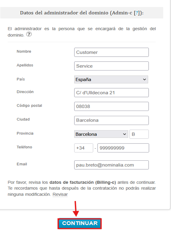 Una vez rellenados, haz lo mismo con los del "Contacto Administrativo". Revisa que todos los datos sean correctos y haz clic en el botón “Continuar”: