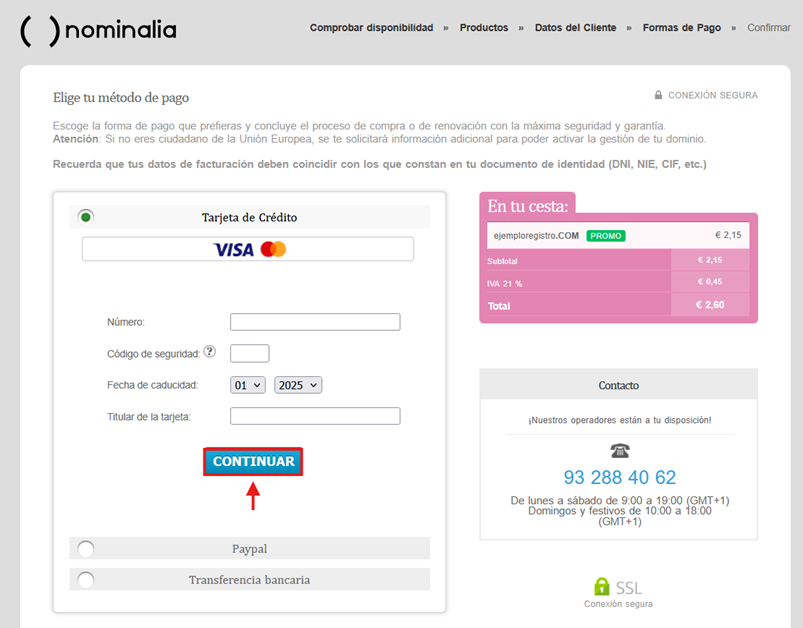 Se te cargará el carrito de la compra con tu dominio, revisa que esté escrito correctamente y haz clic en el botón “Continuar”: