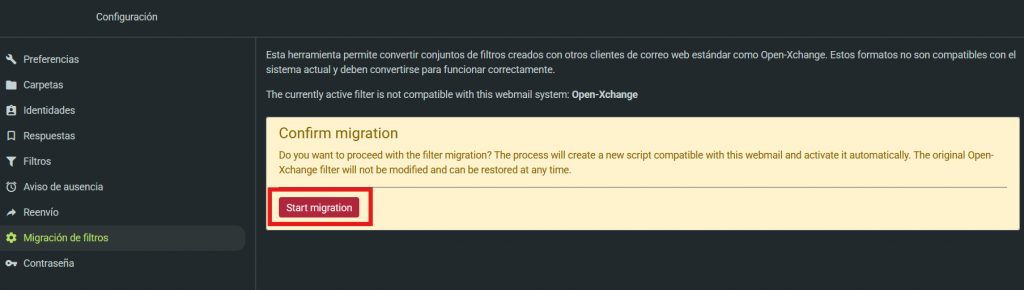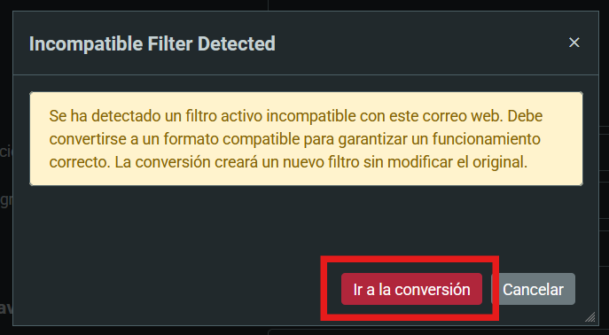 Esto ocurre porque el sistema de filtros del antiguo Webmail no es compatible con el nuevo, por ello, debe hacerse una conversión. Para ello, haz clic en el botón de "Ir a la conversión":