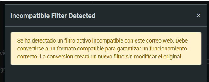 Estás revisando la nueva interfaz de Webmail y quieres ver los filtros que tienes creados o añadir nuevos, y de repente, te aparece un error que dice "Incompatible Filter Detected":