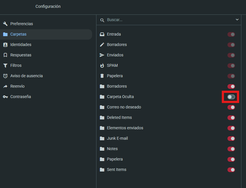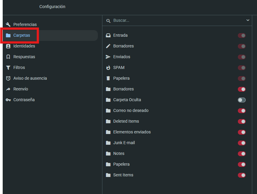 Para activar o desactivar la suscripción a alguna carpeta, deberás utilizar los selectores que hay a la derecha: