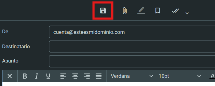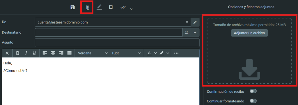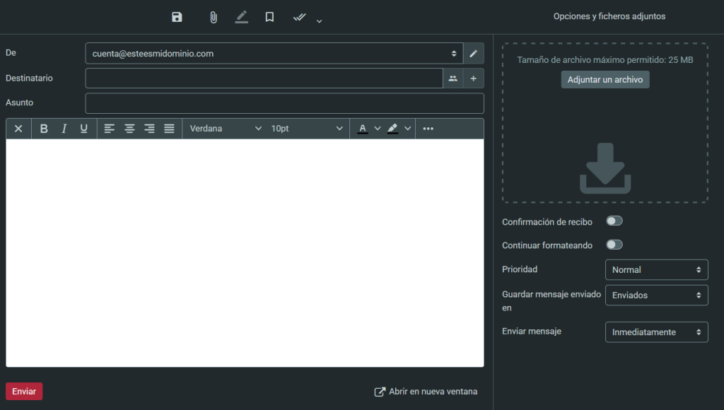 Te aparecerá la pantalla para redactar mensajes en Webmail, con todas sus funciones extra, que te explicamos a continuación: