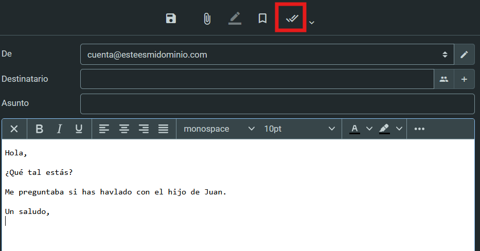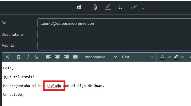 Al redactar los correos puedes activar este sencillo corrector ortográfico que examinará lo que vas escribiendo y te avisará si hay alguna falta de ortografía. Para activarlo, haz clic en el icono de "Corrector ortográfico":