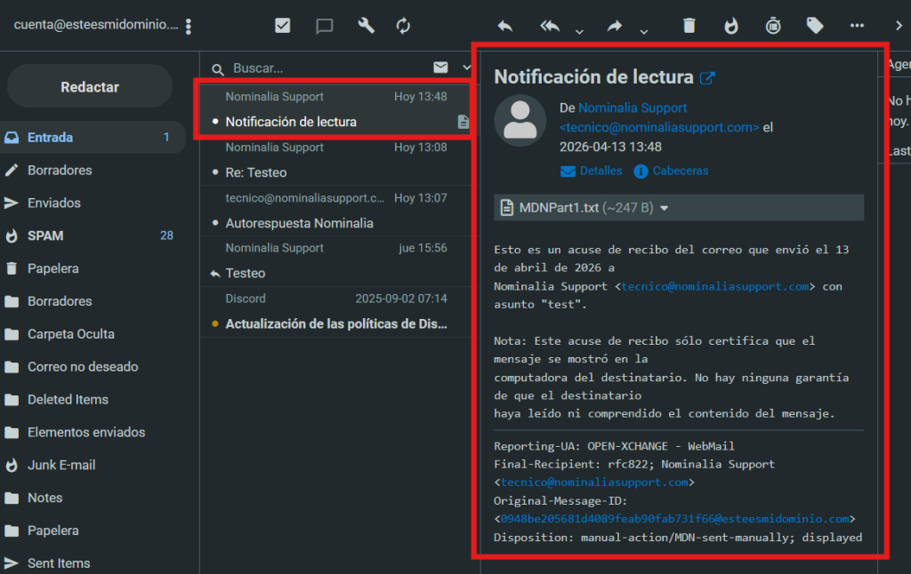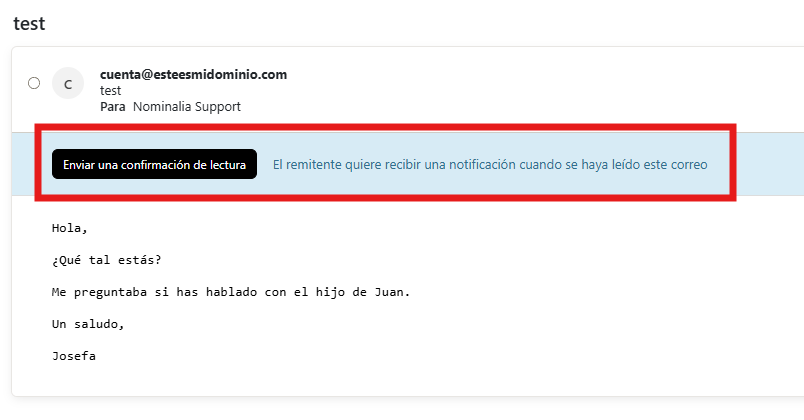 Si el destinatario hiciera clic en el botón de "Enviar una confirmación de lectura", el remitente recibiría un correo como el siguiente, confirmándolo: