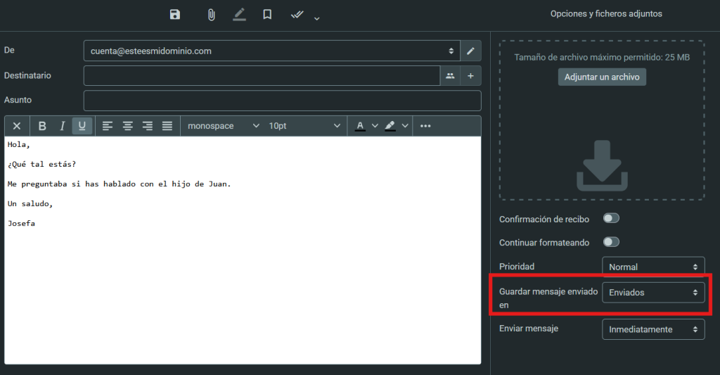 Por defecto, todos los mensajes enviados se guardan en la carpeta "Enviados" de tu correo. Pero si quieres que algún correo enviado en concreto se guarde en otra carpeta, puedes hacerlo con esta opción: