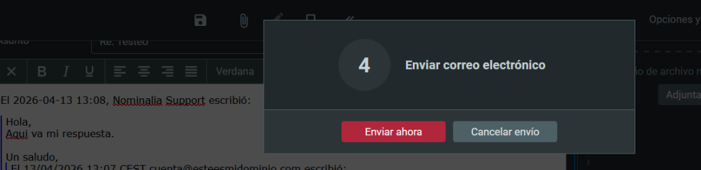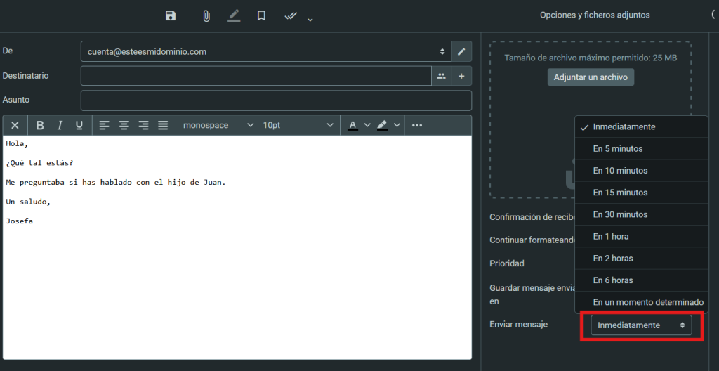 A todos nos ha pasado alguna vez que al clicar en enviar el correo, justo nos hemos acordado de que nos hemos olvidado de indicar algo o adjuntar un fichero. Esta opción, te da unos segundos para reaccionar y cancelar el envío. De esta forma, puedes modificarlo y enviarlo finalmente.