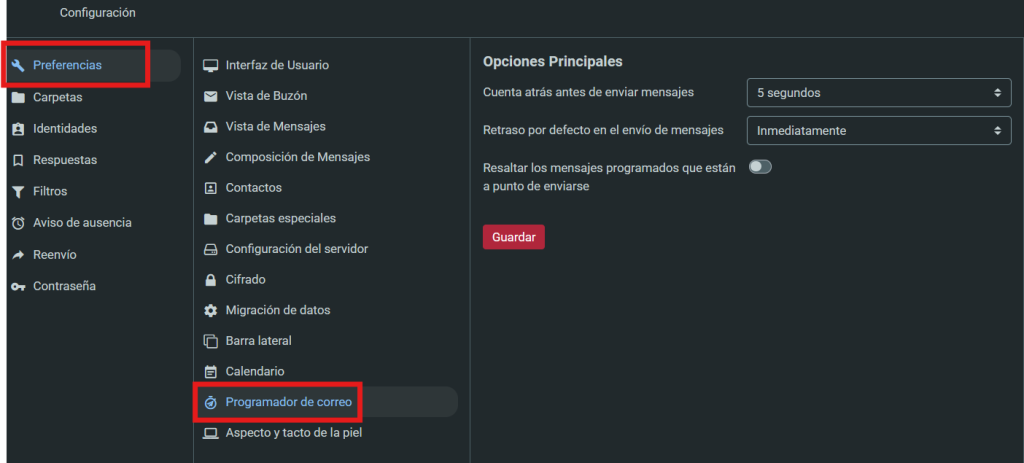 2. Ve al menú "Preferencias" y luego al "Programador de correo". A la derecha, verás las opciones actuales: