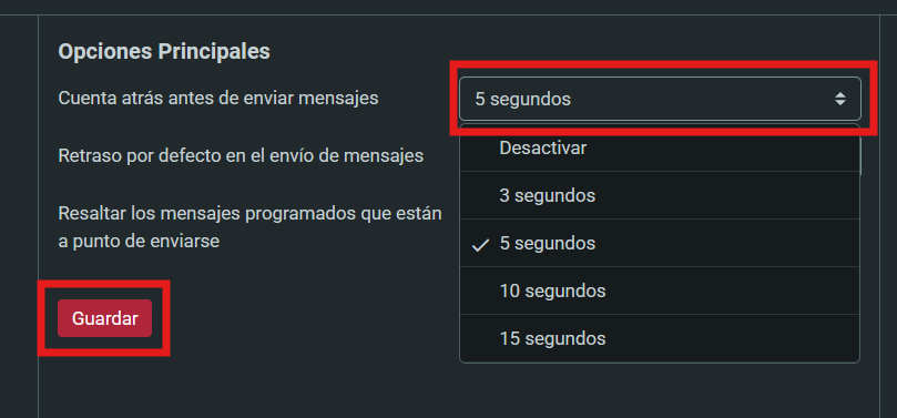 3. En el desplegable "Cuenta atrás antes de enviar mensajes", escoge los segundos que deseas tener (o desactiva la opción si lo prefieres) y luego, haz clic en el botón "Guardar":