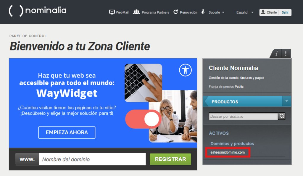 Primero accede a tu Zona Cliente de Nominalia y en la columna de la derecha, haz clic sobre tu dominio: