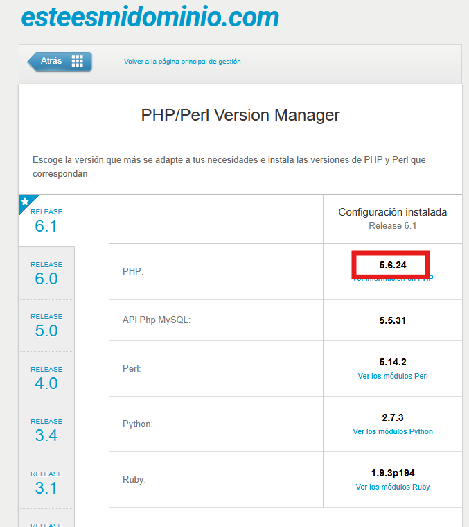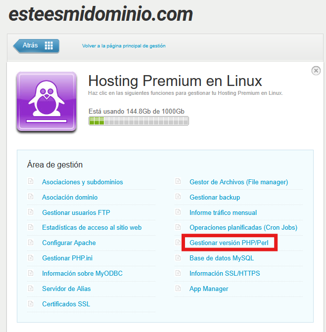 Luego, haz clic sobre "Gestionar versión PHP/Perl":