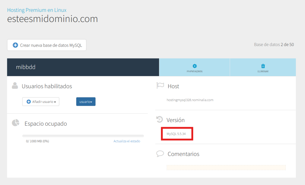 Aquí verás todas tus bases de datos y bajo "Versión", verás la versión de MySQL que utilizan: