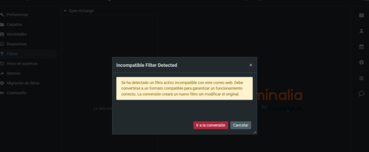 En cada acceso a la configuración global, se le pedirá al cliente que importe el filtro SI existe un filtro de OpenXchange. El cliente puede cerrar la ventana, pero en cada acceso posterior a esta sección o en cada acceso a la Gestión de Filtros, Mensaje de vacaciones y Gestión de reenvíos, la ventana volverá a aparecer.