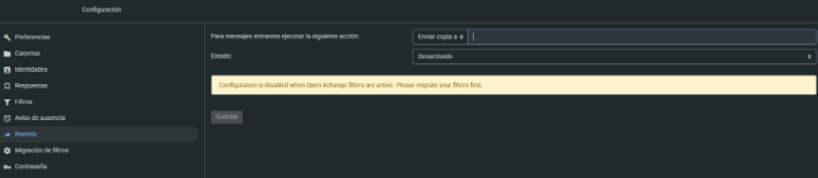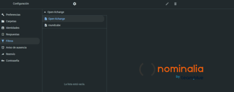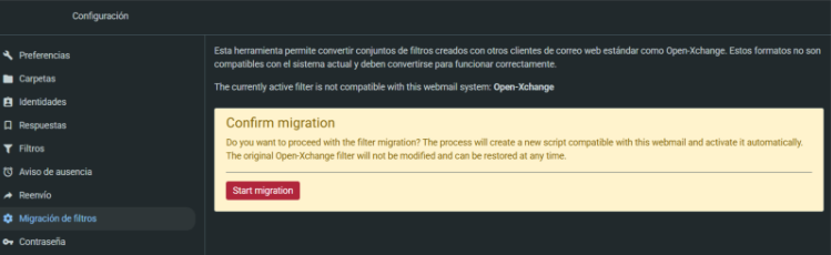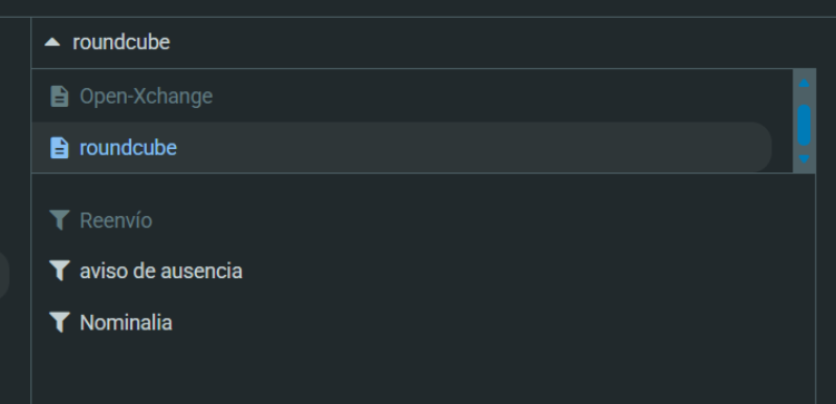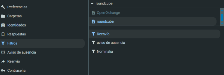 El usuario encuentra todos los filtros disponibles en Configuración > Filtros. En la barra superior, el usuario puede ver el nuevo filtro importado (etiquetado temporalmente como “Roundcube”) y el filtro original que sigue funcionando en el antiguo Webmail (etiquetado temporalmente como “OpenXchange”).