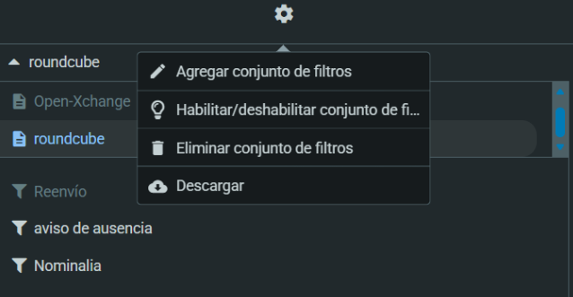 Esto es normalmente cierto, excepto con OpenXchange: OX crea sus propios ajustes de filtros con una sintaxis muy específica, y no es compatible con la sintaxis genérica de las reglas de filtrado. Esto hace que los filtros de OX no sean compatibles con Roundcube (o cualquier otro webmail) y requiera un importador. Por diseño, OpenXchange crea un filtro “OpenXchange” y Roundcube crea un filtro “Roundcube”, aunque se pueden crear y modificar más filtros. La buena noticia es que Roundcube permite gestionar múltiples filtros.