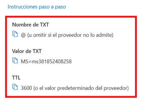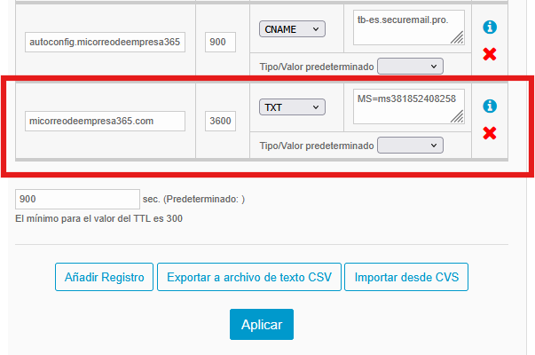Añade el registro TXT que te han indicado desde Office 365. En nuestro ejemplo era el siguiente: