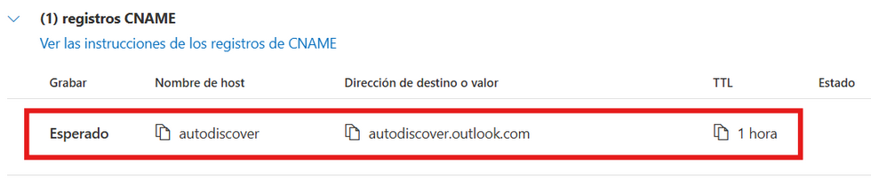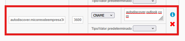 Añade el registro CNAME que te han indicado desde Office 365. En nuestro ejemplo era el siguiente: