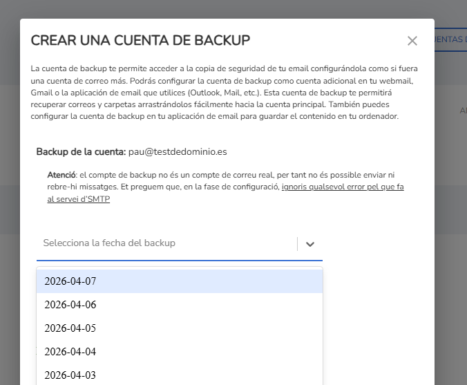 La interfaz abre una ventana superpuesta que pide primero elegir la copia de seguridad; en estado normal (buzones con más de 5 días de antigüedad) las copias de seguridad están disponibles diariamente durante 5 días.