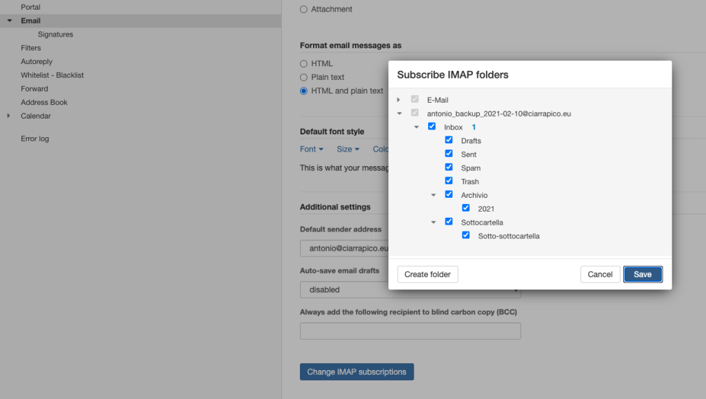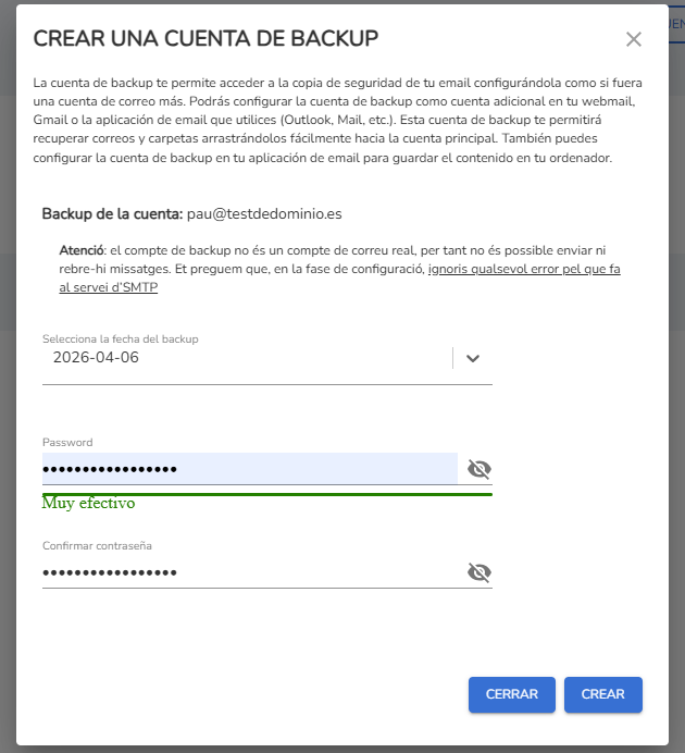 Una vez creada la cuenta de copia de seguridad mediante el panel de control, la carpeta no es visible por defecto en el webmail.