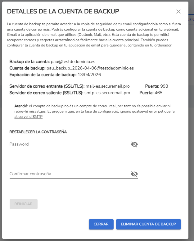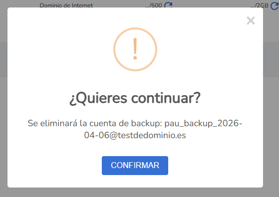 En cualquier momento el cliente también puede eliminar la cuenta de copia de seguridad, eso no significa borrar la copia de seguridad sino solo borrar la cuenta temporal. En cualquier paso, se abre una alerta por si acaso.