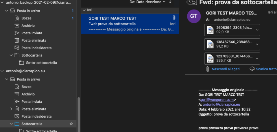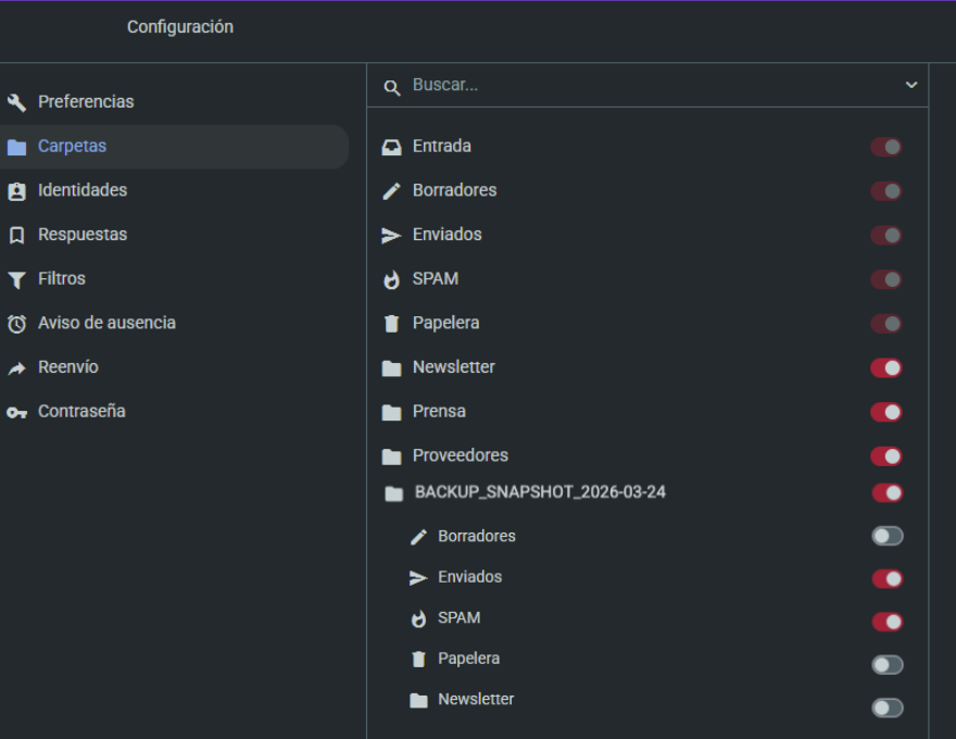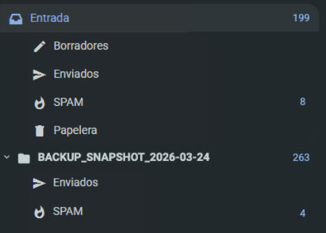 El uso de la cuenta de copia de seguridad es extremadamente fácil en el nuevo webmail. La creación de la cuenta de copia de seguridad vista anteriormente activa automáticamente la creación de una nueva carpeta virtual en el webmail, con una sintaxis: BACKUP_SNAPSHOT_2026_03_24