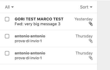 OX permite arrastrar mensajes individuales o múltiples, pero no carpetas enteras. Cuando un mensaje se arrastra desde la cuenta de copia de seguridad a la cuenta del buzón, el mensaje o mensajes se marcan con un tachado.