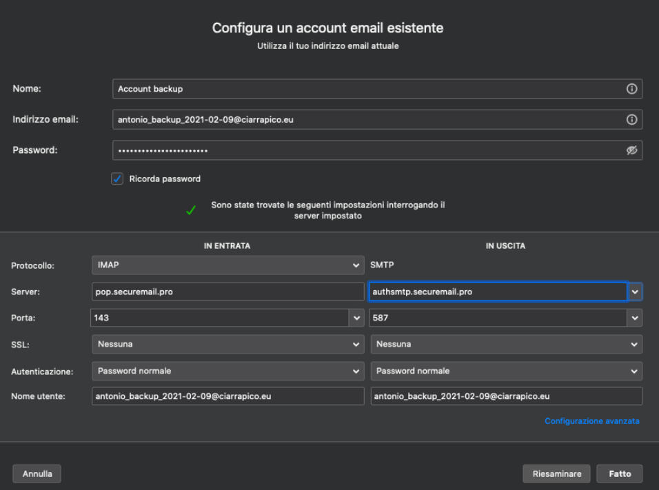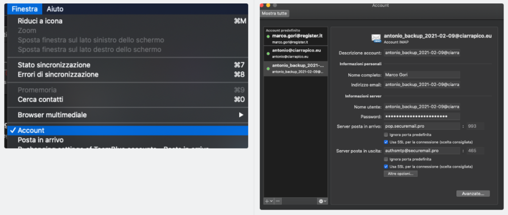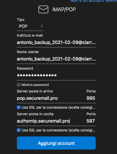 Añade la cuenta de copia de seguridad como cuenta adicional, seleccionando la opción POP: este protocolo permite descargar el contenido en el dispositivo local. La opción de dejar el correo en el servidor es inútil: la cuenta de copia de seguridad está en modo de solo lectura.