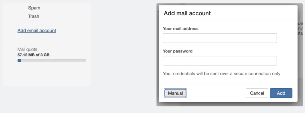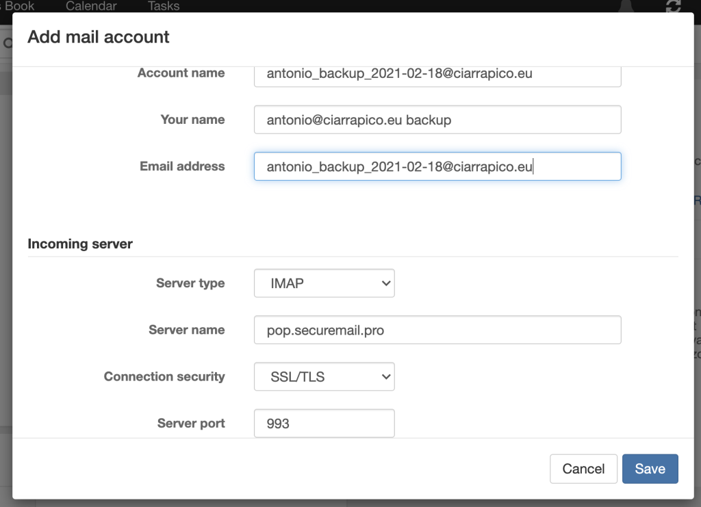 La cuenta de copia de seguridad se puede añadir como cuenta adicional utilizando la función del webmail OX; ve a configuración manual.
