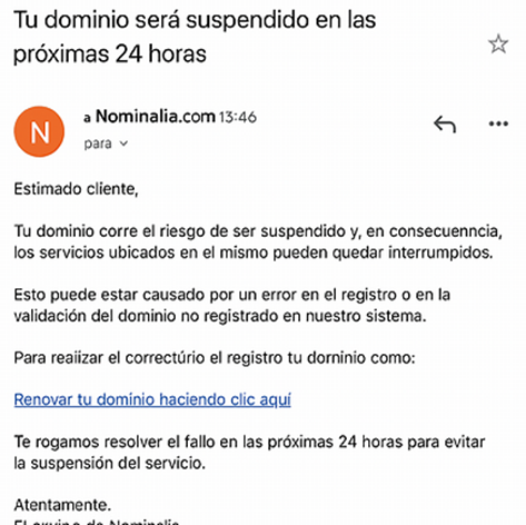 Recibes un email de Nominalia diciendo que tu dominio será suspendido en las próximas horas. El enlace te lleva a una web falsa que imita la oficial de Nominalia. Si introduces tus datos, se los estás dando al estafador.
