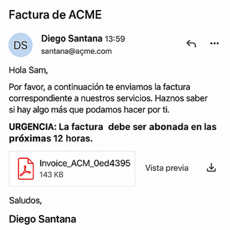 Puedes ver que el remitente usa santana@açme.com en lugar de @acme.com, lo que puede pasar desapercibido. Además, tiene una urgencia exagerada, presionando al destinatario para pagar sin comprobarlo antes. También incluye una factura en PDF con instrucciones de pago que podrían haber sido manipuladas.