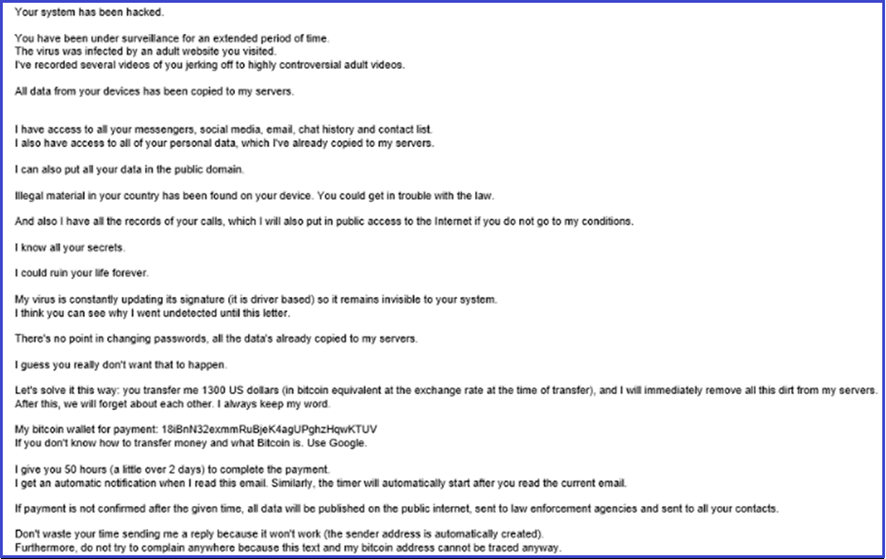 Ejemplo: recibes un email con un asunto muy alarmante, normalmente en inglés (“Your system has been hacked”) o con una mala traducción, y con una exigencia de pago en bitcoins en 48 horas.